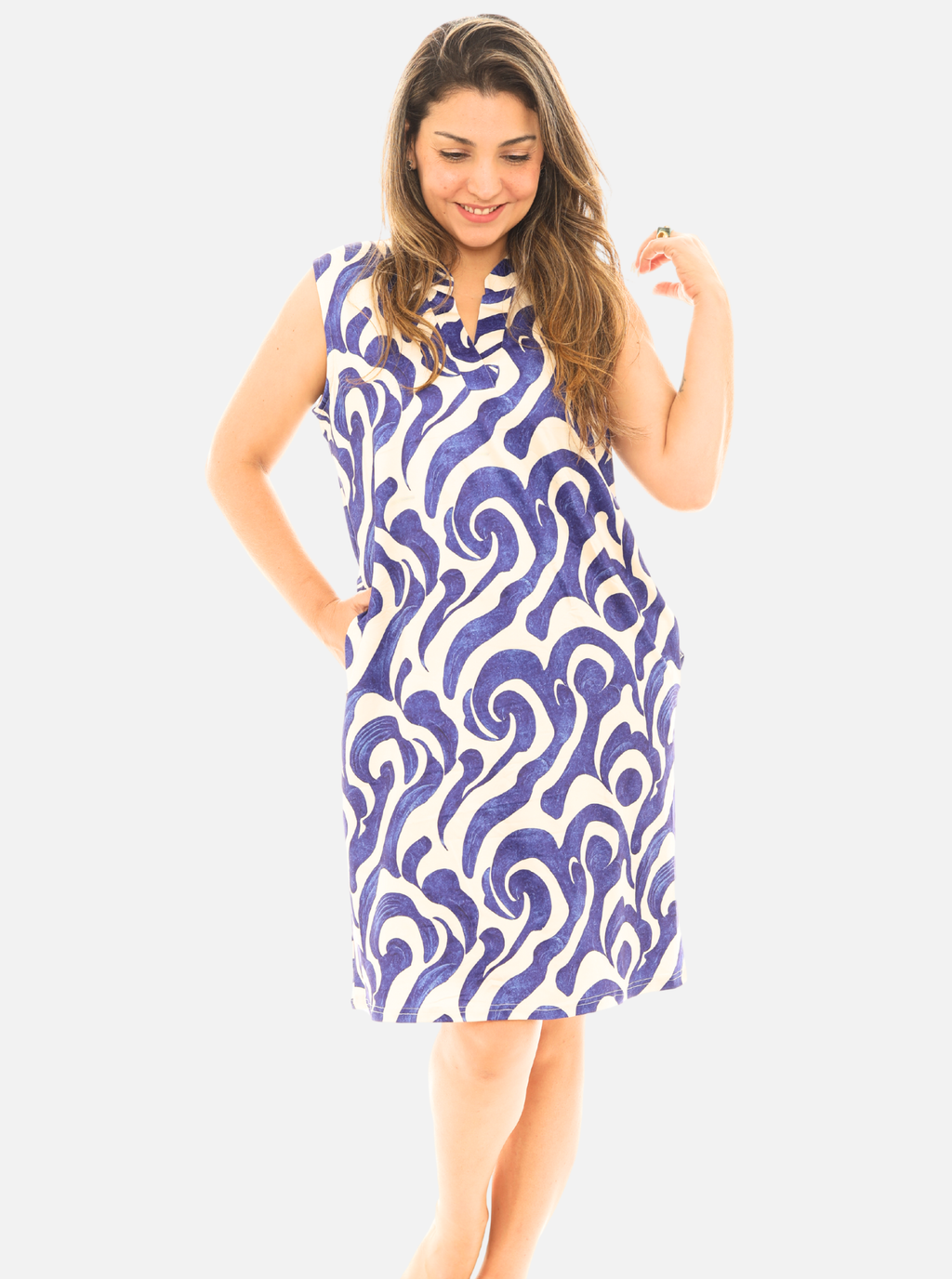 Women’s UPF 50+ Sun Protection Dress – Sleeveless Beach & Casual with Blue Wave Print