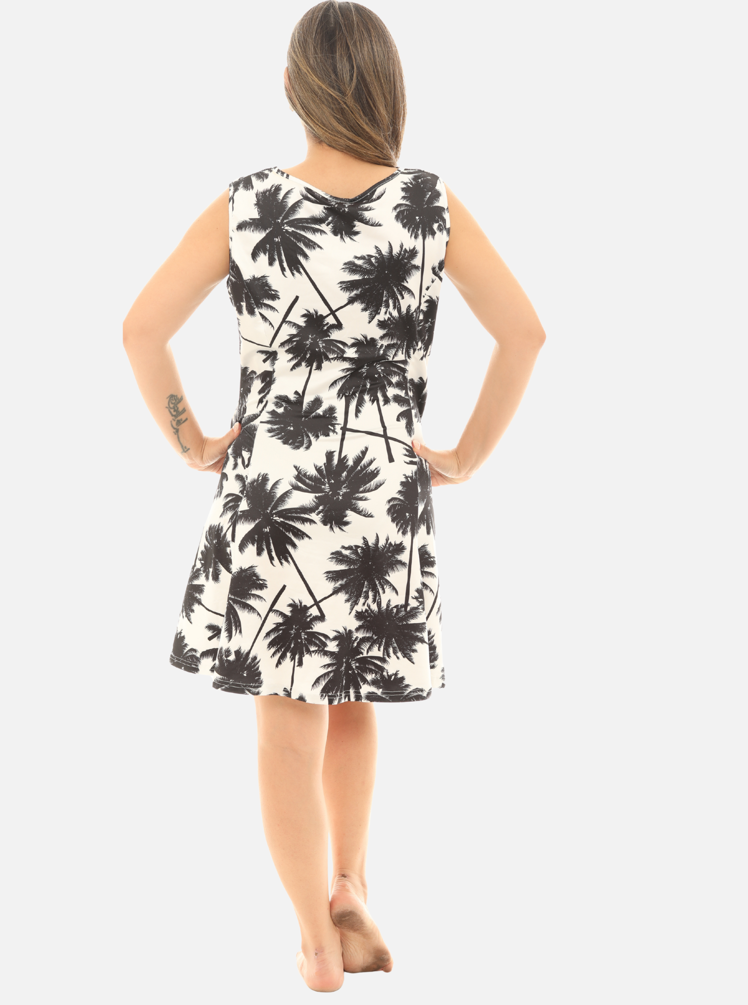 Women’s UPF 50+ Sun Protection Dress – Sleeveless White & Black Palm Tree Print