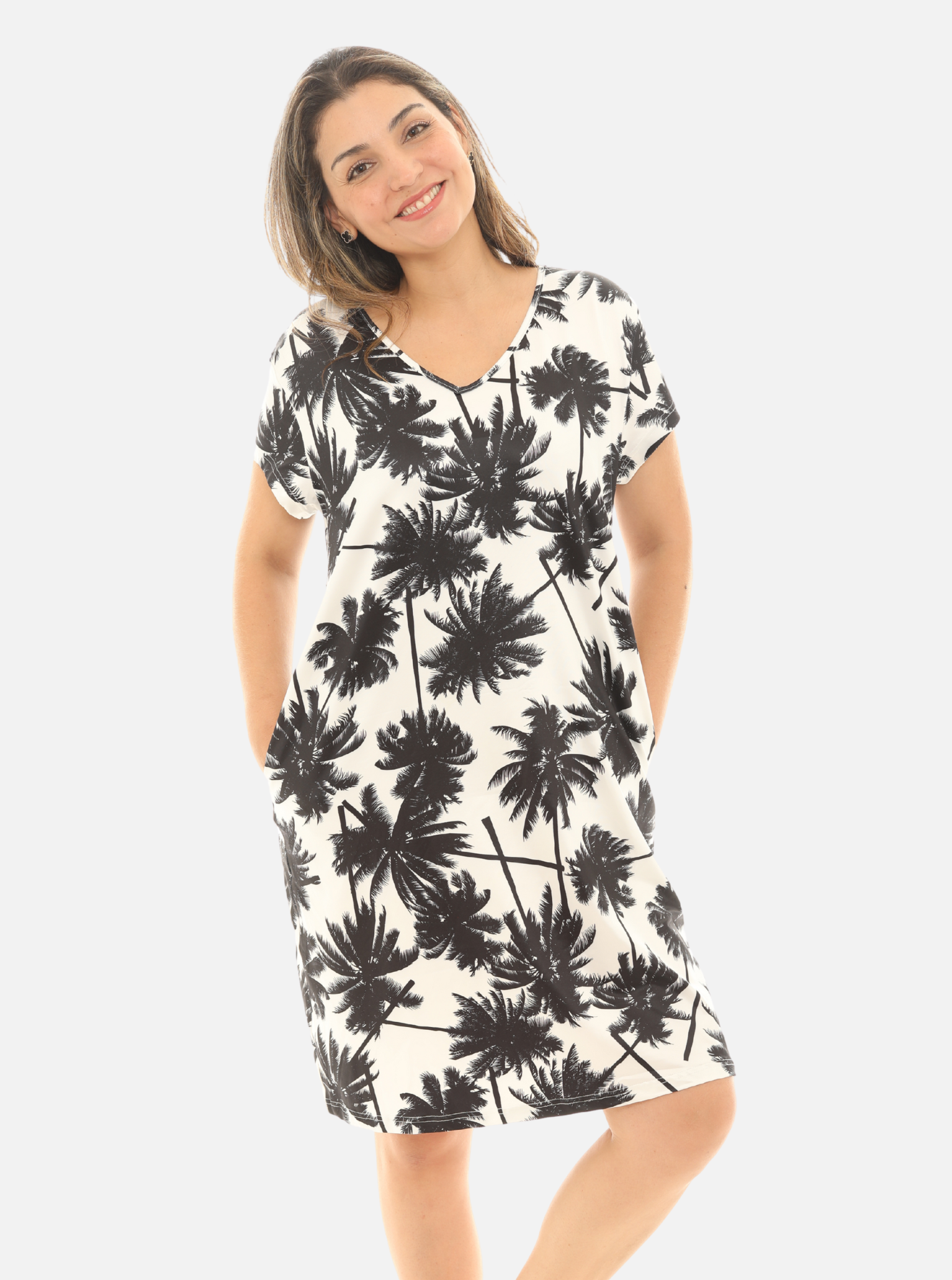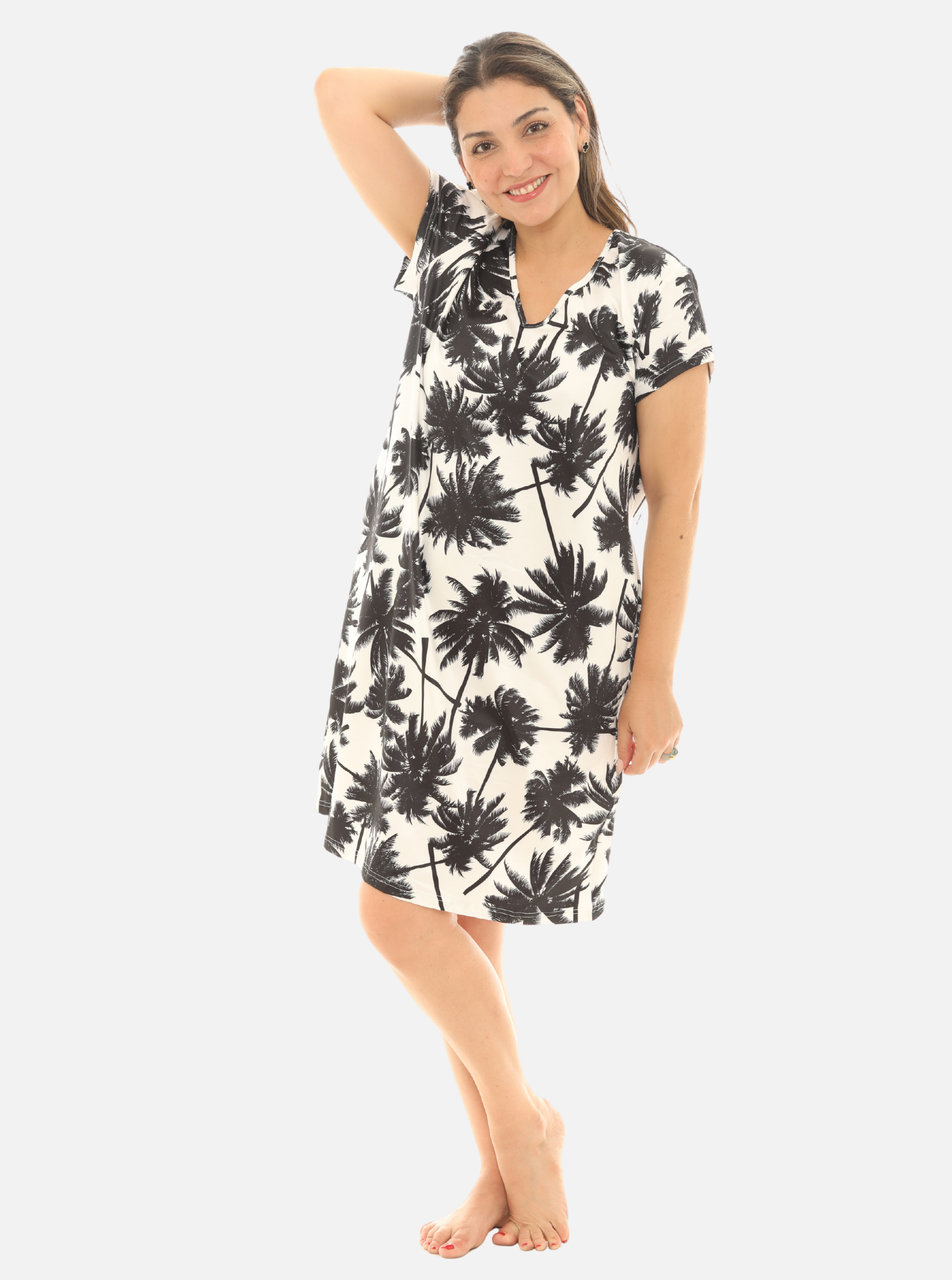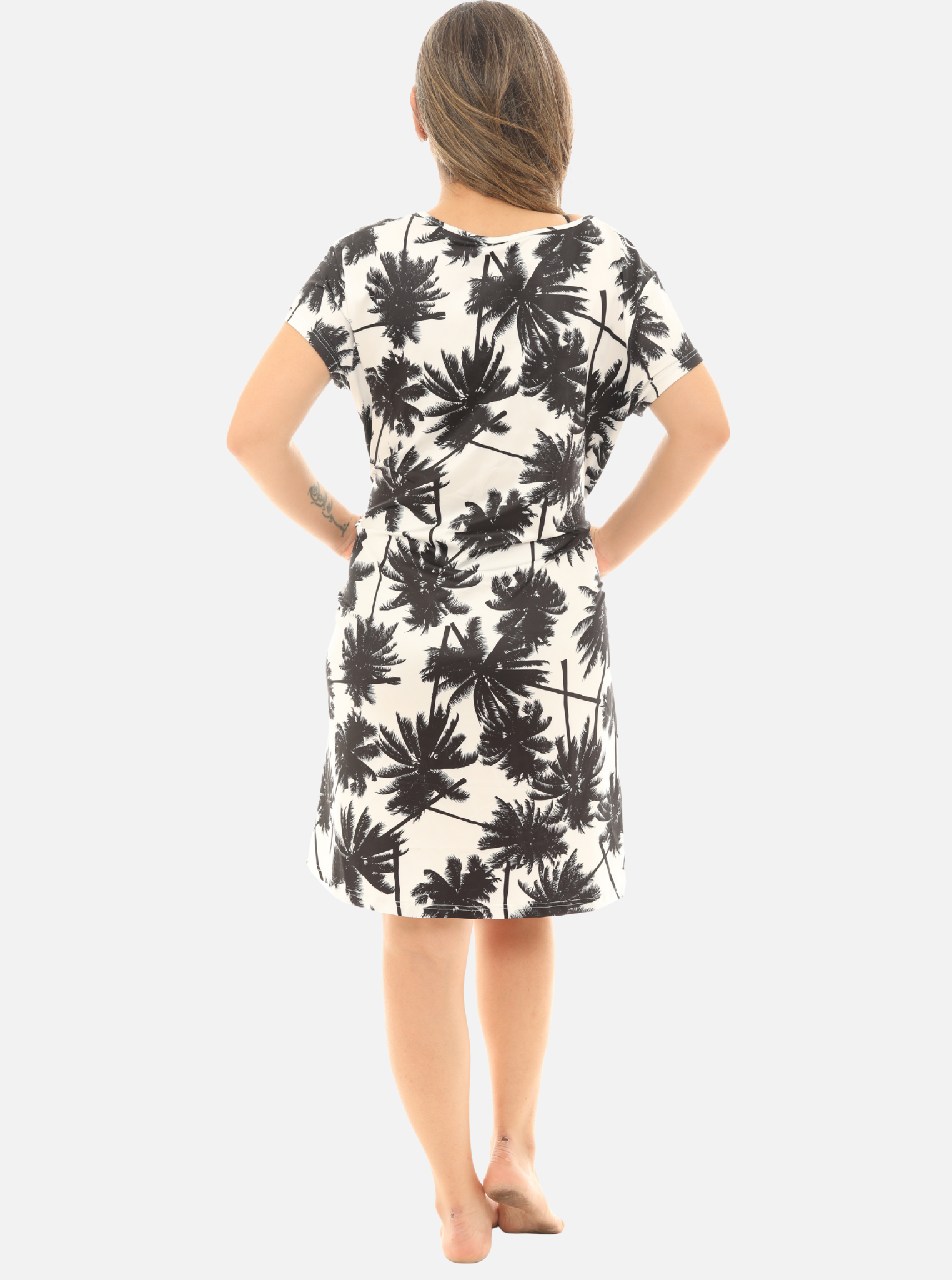 Women’s UPF 50+ Sun Protection Dress – Short Sleeves White & Black Palm Tree Print