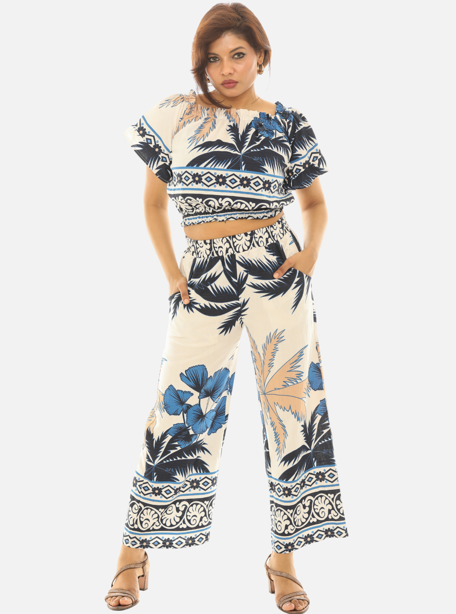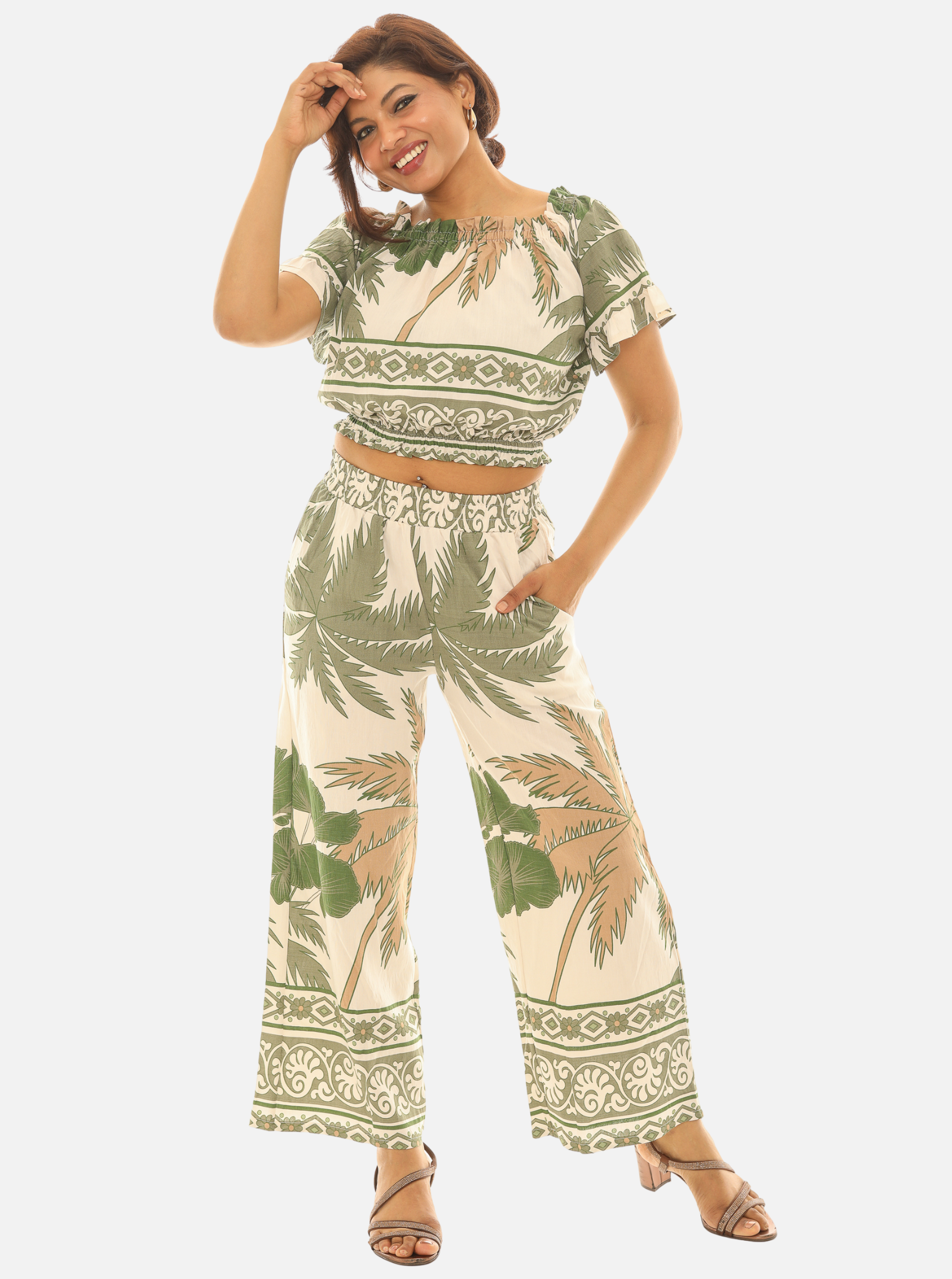 A modern two-piece set designed for effortless warm-weather style. This matching crop top and ankle-length wide leg pant features an all-over palm tree print for a relaxed, coastal look. Easy to wear together or styled separately.